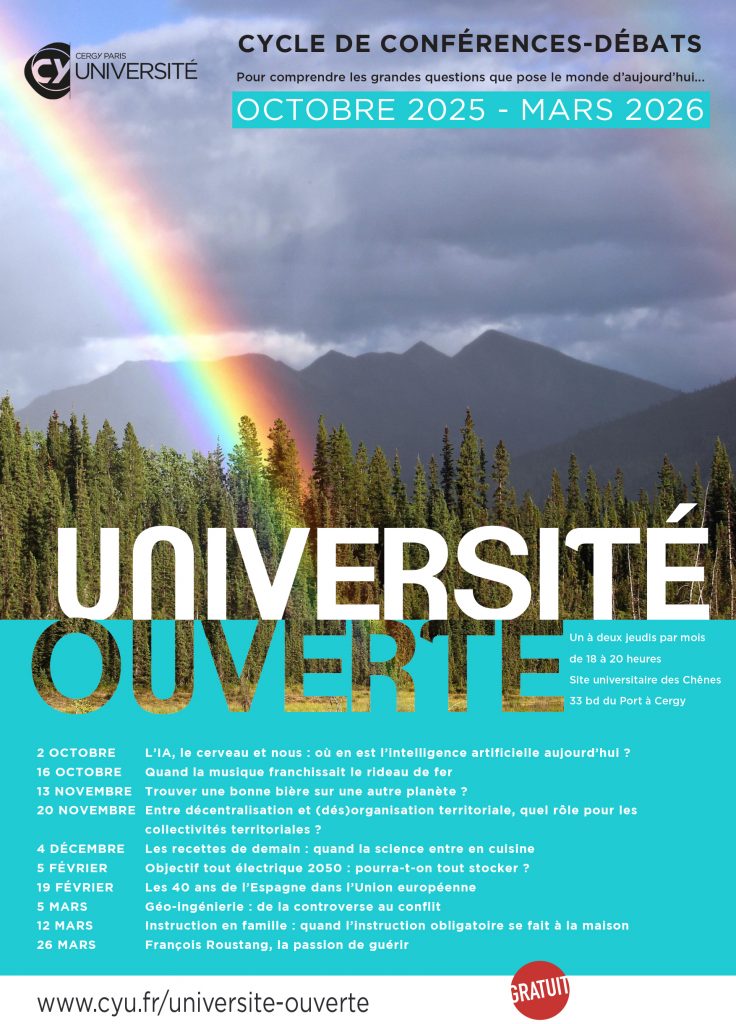 Parce que la connaissance et la culture doivent être accessibles à tous, CY Cergy Paris Université propose, depuis vingt-trois ans, le cycle de conférences-débats de l’Université Ouverte destiné à un large public désireux de comprendre les enjeux d’un monde en pleine transformation. Des chercheurs et spécialistes de différents domaines nous font l’honneur d’intervenir — 10 jeudis par an — pour présenter leurs travaux de recherche et répondre à nos interrogations sur des sujets variés, innovants et toujours passionnants.